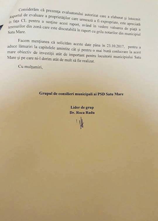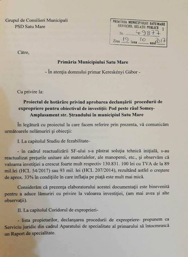 Consilierii municipali PSD au depus o serie de obiecții și au solicitat lămuriri primarului municipiului Satu Mare, Kereskényi Gábor, la proiectul de hotărâre privind aprobarea declașării procedurii de expropriere pentru obiectivul de investiții ”Pod peste râul Someș –Amplasament str. Ștrandului în municipiul Satu Mare”, care va fi supus aprobării Consiliului Municipal în ședința de luni, 23 octombrie .
