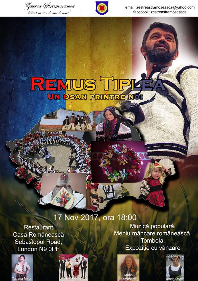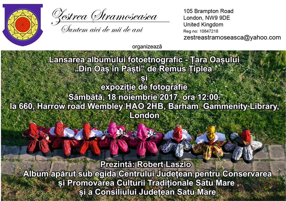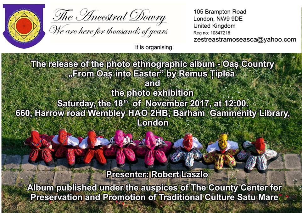 Asociația românească „Zestrea Strămoșească” din Londra, sub înaltul patronaj al Ambasadei României în Marea Britanie organizează în data de 17 noiembrie, ora 18:00 la restaurantul „Casa Românească” din Londra, expoziția de artă fotografică „Remus Țiplea- un oșan printre noi”, iar în data de 18 noiembrie, ora 12:00 la librăria „Barham Gammenity” din Londra, va avea loc lansarea albumului fotoetnografic Țara Oașului, „Din Oaș în Paști” de Remus Țiplea, realizat cu sprijinul financiar al Consiliului Județean Satu Mare. Evenimentul va fi moderat de Robert Laszlo, manager al Centrului Județean pentru Conservarea și Promovarea Culturii Tradiționale Satu Mare.