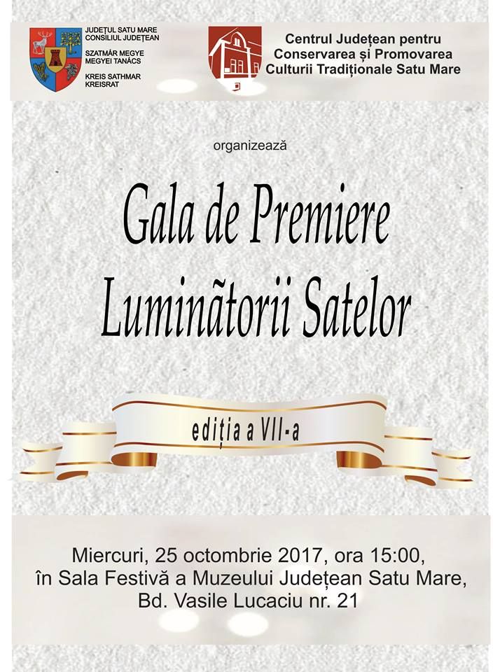 Centrul Judeţean pentru Conservarea şi Promovarea Culturii Tradiţionale Satu Mare cu sprijinul Consiliului Judeţean organizează miercuri, 25 octombrie de la ora 15:00 în Sala Festivă a Muzeului Județean Satu Mare, cea de-a VII-a ediție a Galei de premiere „Luminătorii satelor”.