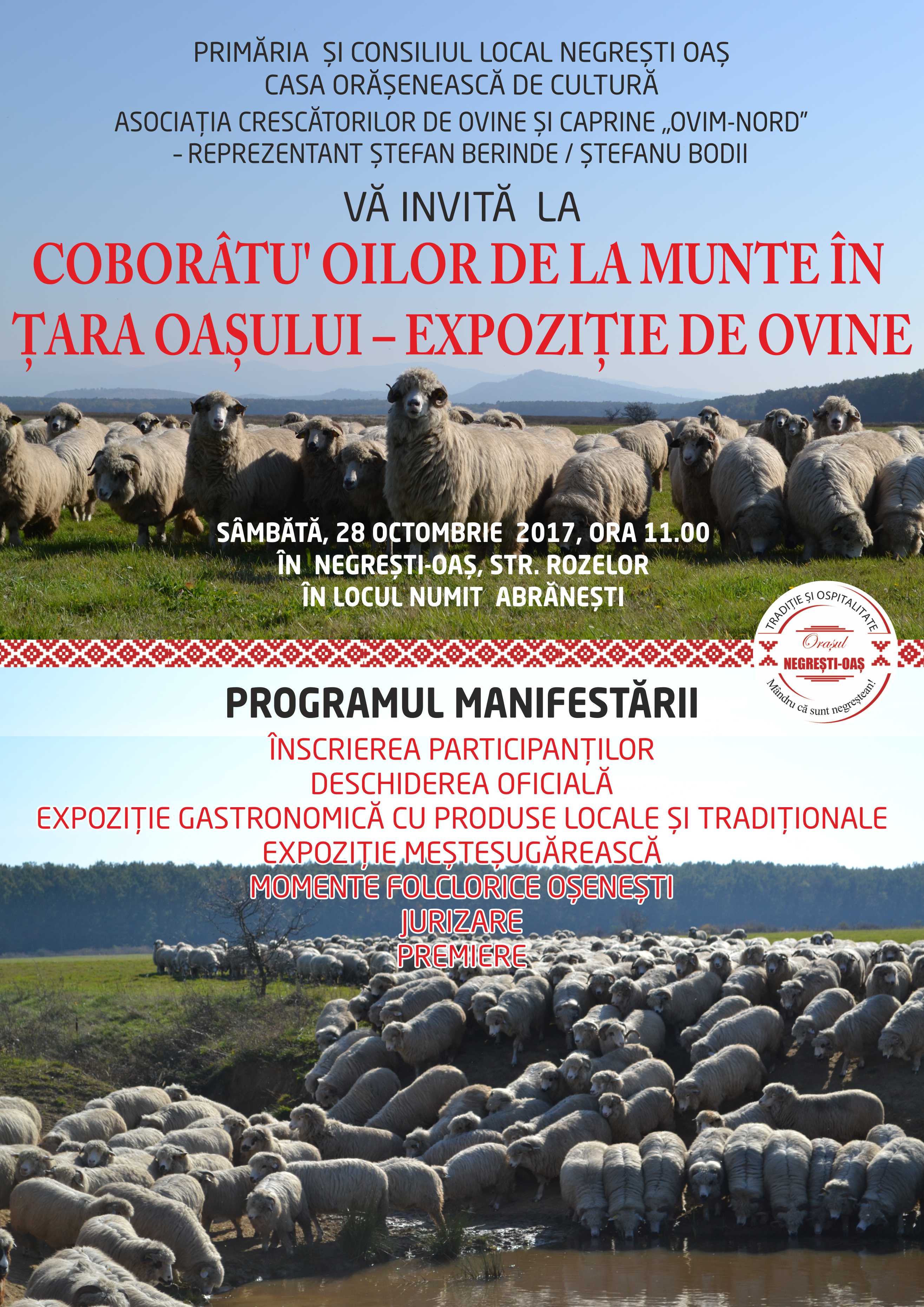 Sâmbătă, 28 octombrie 2017, începând cu ora 11:00, pe strada Rozelor (Dâmbu’ lui Hașca), la locul numit Abrănești, va avea loc prima ediție a evenimentului Coborâtu’ oilor de la munte în Țara Oașului – expoziție de ovine. Acest eveniment a fost inițiat de crescătorul de ovine Berinde Ștefan, cunoscut în zonă sub numele de Ștefanu Bodii, și este organizat de acesta în colaborare cu Primăria și Consiliul local Negrești-Oaș, Casa Orășenească de Cultură și Asociația crescătorilor de ovine și caprine Ovim-Nord din județul Satu Mare.
