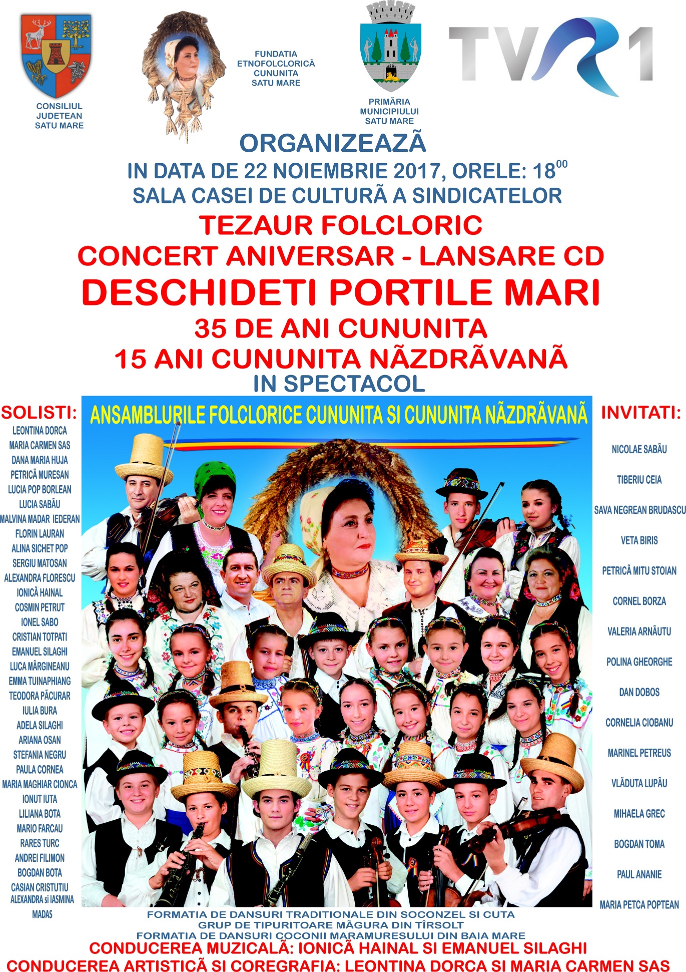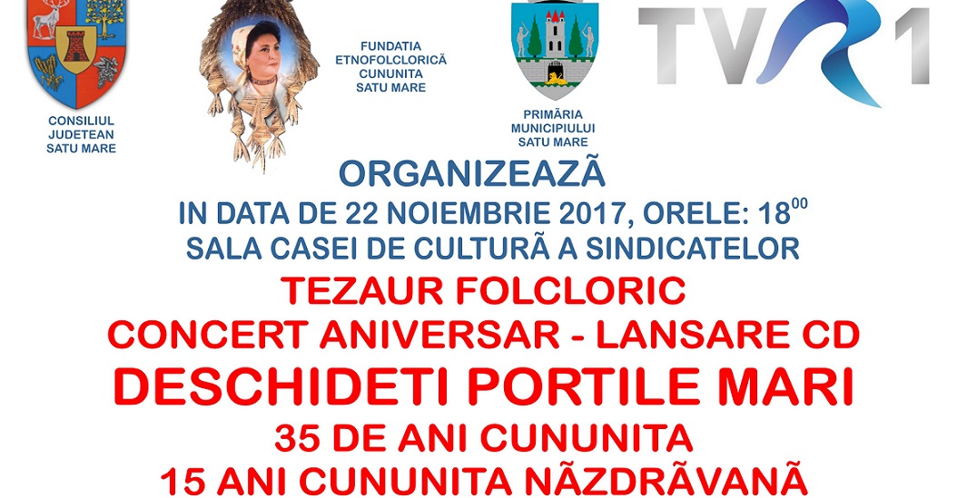 Evenimentul aniversar - CONCERTUL DESCHIDETI PORTILE MARI are loc in data de 22 noiembrie 2017, ora 18, La Casa de Cultura a Sindicatelor din Satu Mare. Evenimentul are loc în organizarea Fundatiei Etnofolclorice Cununița în parteneriat cu Consiliul Județean Satu Mare și Primăria și Consiliul Local Satu Mare, prin Centrul Cultural G.M. Zamfirescu, în coproductie cu TVR1, emisiunea Tezaur Folcloric.