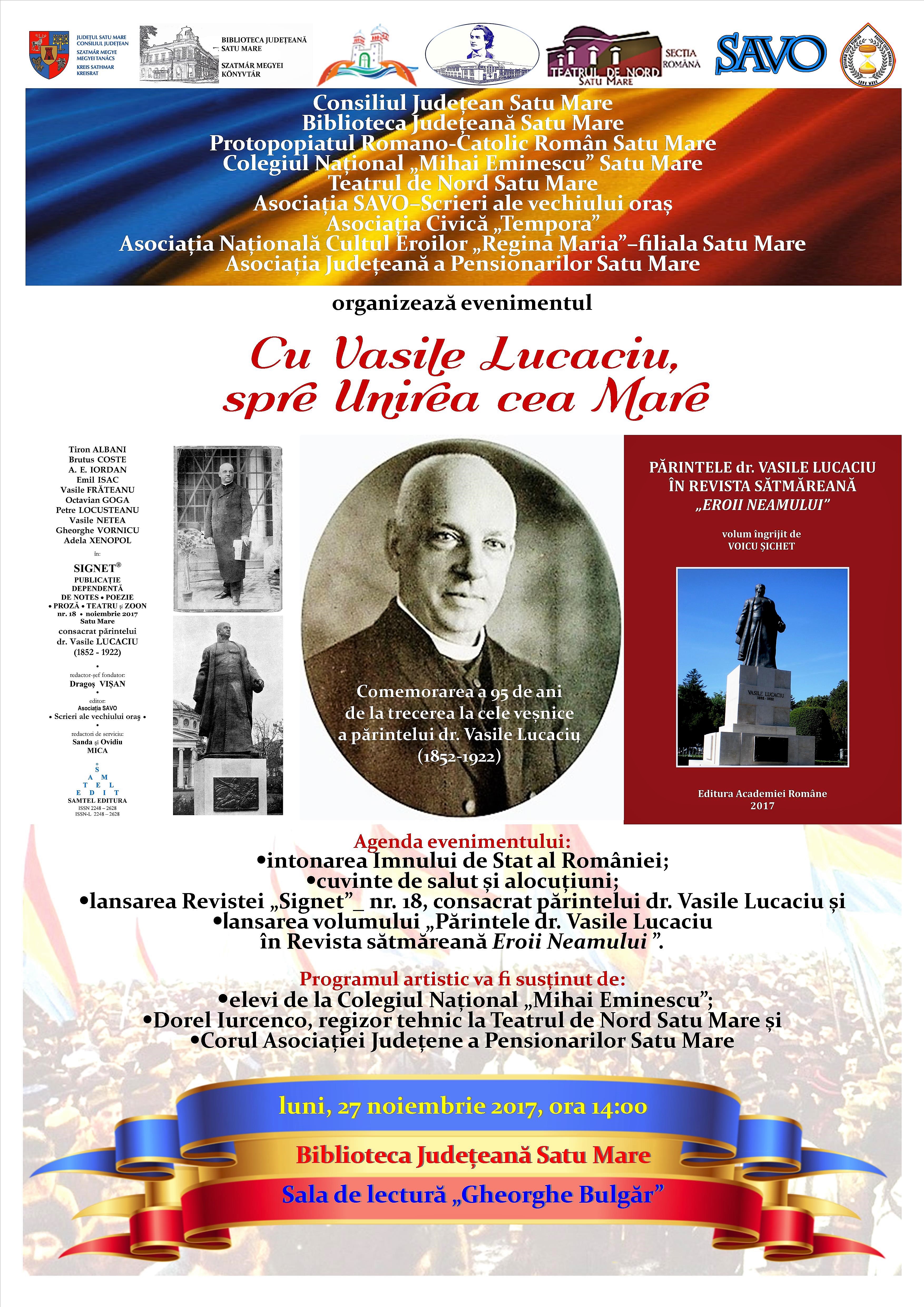 Biblioteca Județeană Satu Mare, cu sprijinul financiar al Consiliului Județean Satu Mare și în parteneriat cu Protopopiatul Romano-Catolic Român Satu Mare, Colegiul Național „Mihai Eminescu”, Teatrul de Nord, Asociația SAVO–Scrieri ale vechiului oraș, Asociația Civică „Tempora”, Asociația Națională Cultul Eroilor „Regina Maria”–filiala Satu Mare și Asociația Județeană a Pensionarilor Satu Mare organizează evenimentul „Cu Vasile Lucaciu, spre Unirea cea Mare”.