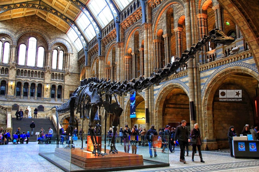 Natural History Museum (Muzeulde Istorie Naturală) Unul dintre cele mai mari muzee de istorie naturală din lume, situat într-un edificiu în stil neogotic lângă cel mai frumos carusel pe care l-am văzut vreodată. Aici, dacă aveți copii, cu siguranță nu se vor plictisi, începând cu sala principală dominată de scheletul dinozaurului ”Diplodocus”, apoi galeria dinozaurilor, mamiferelor și toate vietățile de pe fața pământului. Daca ajungeţi sa vizitaţi Muzeul de Istorie Naturală din Londra, nu trebuie să uitaţi să admiraţi şi panourile de pe tavanul din sala centrală a muzeului. Decorate cu plante din toate colţurile lumii, aceste panouri în relief spun fiecare o poveste proprie. Muzeul este împărțit în patru zone: orange zone, blue zone, green zone și red zone (care mi-a plăcut cel mai mult). Din ”earth hall” pe niște scări rulante trecând printr-un glob veți ajunge la galeriile care prezintă evoluția pământului iar la etajele de mai sus, despre vulcani și cutremure, unde este chiar și o platformă care simulează un cutremur. De asemenea foarte populară printre turiştii care vizitează muzeul este şi o sală dedicată mamiferelor mari, unde este prezentat un model enorm al unei balene albastre şi al mai multor elefanţi. Alte săli includ expoziţii dedicate reptilelor, peştilor, păsărilor sau ecologiei, după cum există şi o colecţie impresionantă de minerale şi pietre.