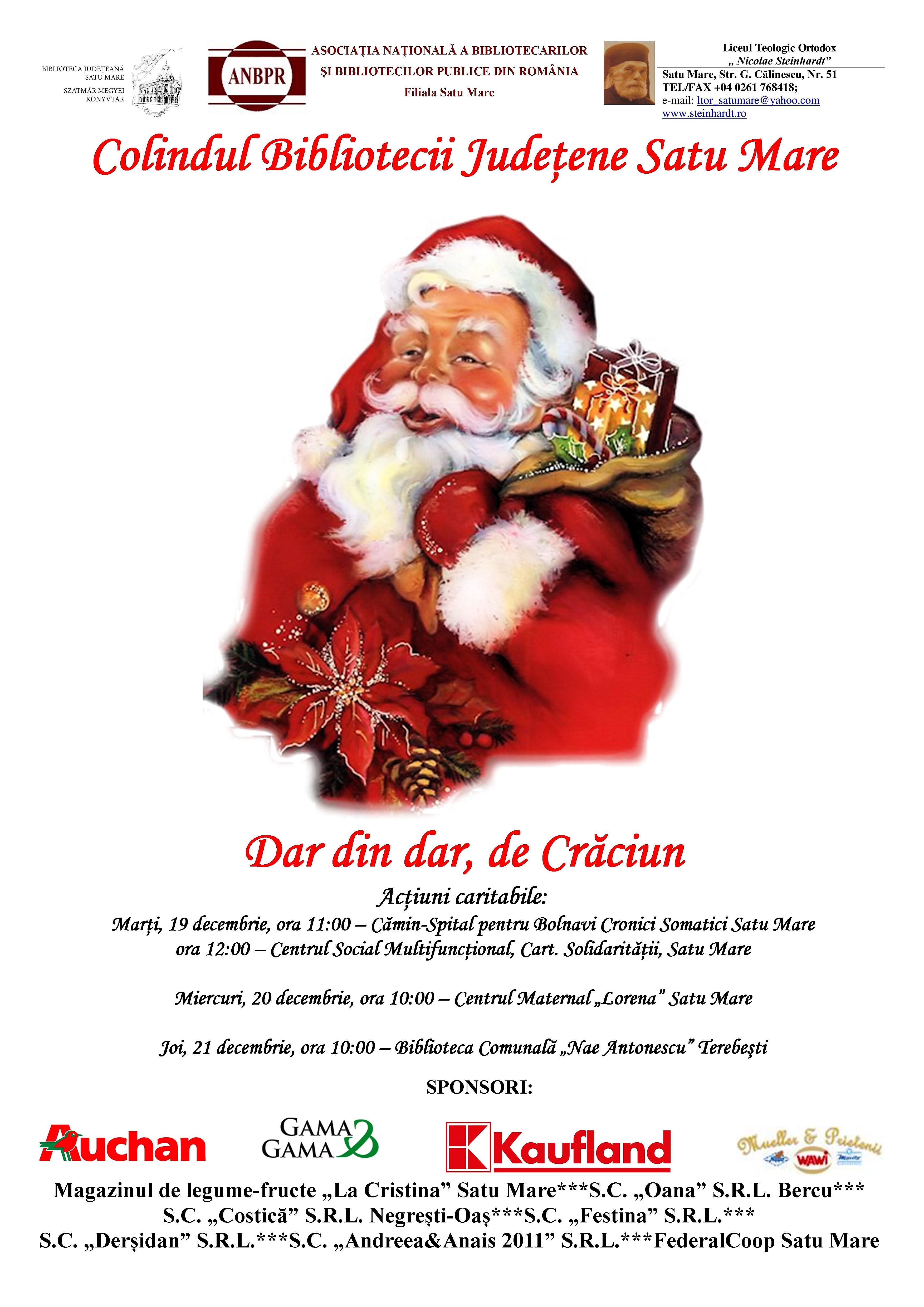 Biblioteca Județeană Satu Mare și Asociația Națională a Bibliotecarilor și Bibliotecilor Publice din România–filiala Satu Mare, în parteneriat cu Liceul Teologic Ortodox Român „Nicolae Steinhardt” Satu Mare și cu sprijinul material al unor sponsori generoși, organizează activitatea „Colindul bibliotecii”, activitate ce oferă prilejul de a derula și o serie de acțiuni caritabile având ca beneficiari persoane de diferite vârste, aflate în dificultate.