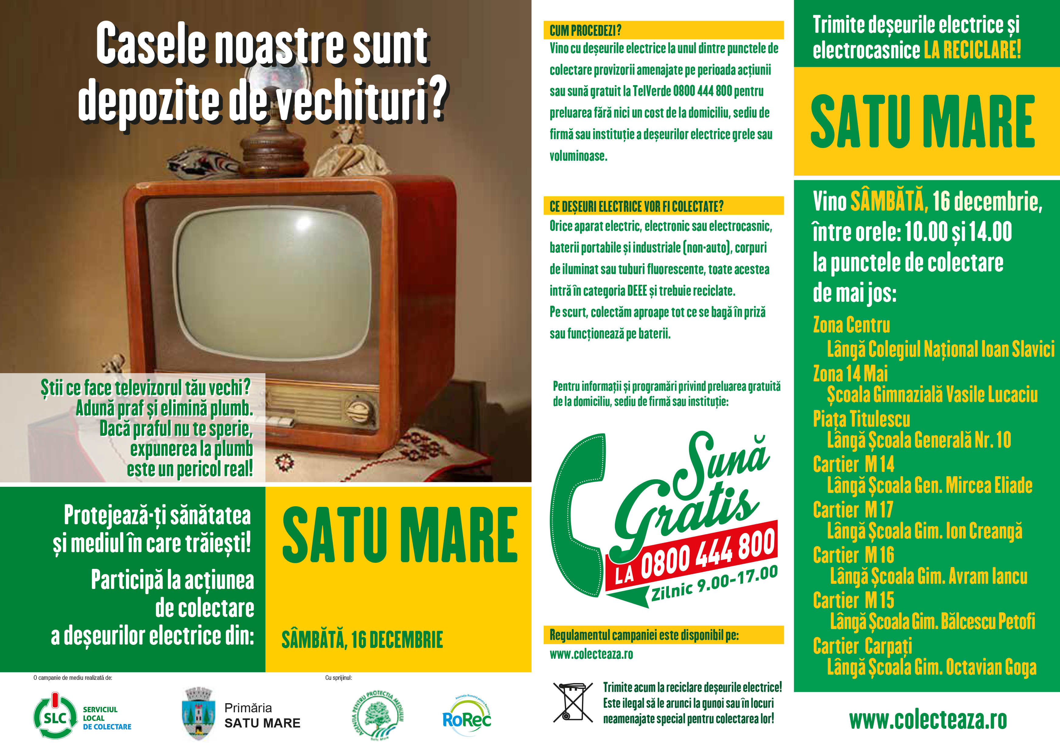 Primăria Municipiului Satu Mare, Asociaţia Română pentru Reciclare RoRec și Serviciul Local de Colectare Satu Mare, în colaboare cu Corpul Voluntarilor Ecologi din cadrul Agenției pentru Protecția Mediului Satu Mare, îi invită cetățenii să participe la o nouă acțiune de colectare a deșeurilor electrice și electronice, care va avea loc sâmbătă, 16 decembrie 2017.