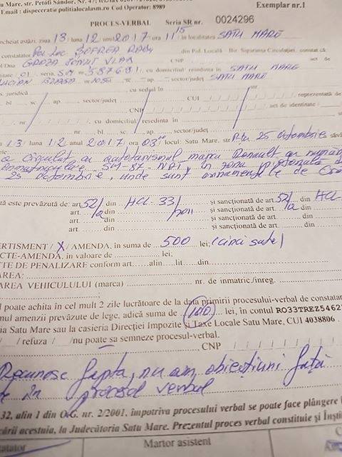 Nu peste mult timp, însă, polițiștii locali l-au amendat. Astfel, conform procesului verbal întocmit de Poliția Locală, ”jmecherul” Groza Ionuț Vlad a fost amendat cu 500 de lei pentru că a circulat cu autoturismul marca Renault Megan având numărul de înmatriculare SM 87 NAT în zona pietonală din Piața 25 Octombrie.