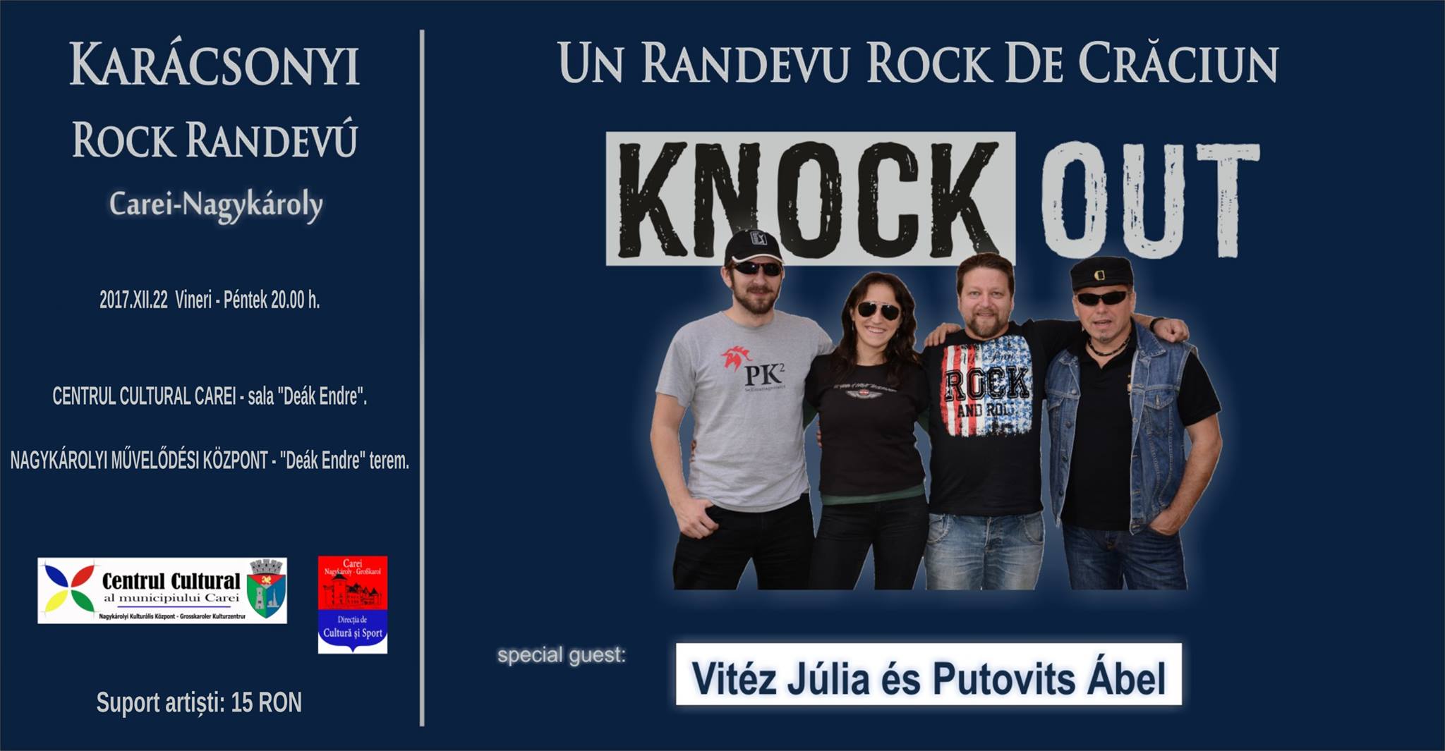 Concert cu trupa Knock Out - Rendez-vous rock de Crăciun. Invitații speciali ai evenimentului sunt Vitéz Júlia și Putovits Ábel. Prețul biletului este 15 lei.