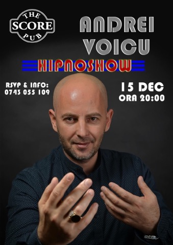 Evenimentul va avea loc vineri, 15 decembrie, ora 20:00 în The Score Pub, unde Andrei Voicu te invita la un show de hipnoza. Pretul unui bilet este de 25 de lei pre-comanda, sau 35 de lei in ziua spectacolului, unde se pot achizitiona de luni pana vineri de la bar intre orele 8:00- 16:00.