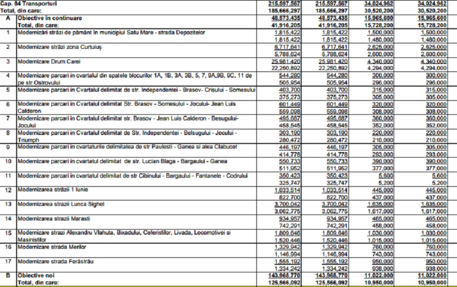 Astfel, în lista obiectivelor de investiții sunt cuprinse, printre altele, 1,69 milioane lei pentru extinderea iluminatului public, 11 milioane lei pentru modernizarea străzilor de pământ și a unor cvartale din cartierele Micro 16 și Carpați II, sau 11 milioane lei pentru începerea lucrărilor la cel de-al treilea pod peste râul Someș.
