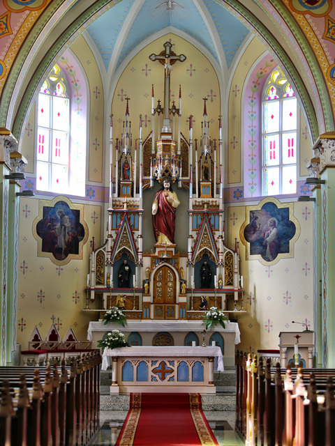 Deteriorările cauzate de război au fost reparate în 1945. După 30 de ani, biserica s-a deteriorat, lucru ce a condus la o nouă lucrare de renovare. Cele mai urgente lucrări au fost executate în 1975, iar în 1976 a fost renovată total în exterior de constructorul Pugner Alexandru. De la turnuri până la bază toată tencuiala a fost înlăturată şi înlocuită de alta cu sistem eşalonat. Biserica renovată exterior a fost sfinţită de Ord. Sipos Francisc în ziua de 17 octombrie 1976. În anii 1977- 1978, a fost restaurat în întregime şi interiorul bisericii de către Bódi Endre, zugrav decorator din Satu Mare. În urma acestei restaurări, în ziua de 04 iunie 1978, duminica Inimii lui Isus, a fost sărbătorită terminarea reuşită a acestei munci grandioase. Bogăţia bisericii o formează: Cele două clopote frumos sunătoare. Cel mare a fost turnat în onoarea Inimii lui Isus în oraşul Sopron (Ungaria) în 1908, iar cel mic în cinstea Maicii Domnului la Sibiu în 1929; Altarul principal şi cele două altare laterale din lemn de stejar; decoraţiile lor din lemn de tei sunt o adevărată capodoperă a meşterilor din Tirol. În această biserică sunt prezente două comunităţi: una de limbă germană, existentă dinainte de 1989, şi comunitatea romano-catolică de limbă română, care a prins viaţă în anul 1992 şi care numără actualmente cca. 160 de familii, cu un număr de aproximativ 500 credincioşi.