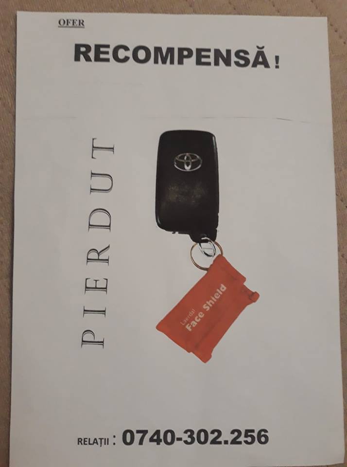 Din cauza unui moment de neatenție, sătmăreanul și-a pierdut cheia de la mașină, este vorba despre o cheie de Toyota, așa după cum se vede în imagini. În momentul în care a fost pierdută această cheie, avea atașat și un breloc de material textil de culoare roșie, de mărimea telecomandei-cheie.