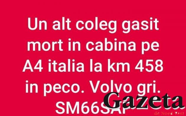Un alt oșan a fost găsit, în această dimineață, mort în Occident. Venea spre casă, însă a decedat într-o parcare în Italia, înainte de Trieste.