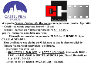 Castel Film Studios & Agenția Central Casting din București, caută persoane pentru figurație pentru realizarea unui film american. Filmările vor avea loc în perioada: 21 maiI – 16 iunie 2018, în Carei și Oradea.
