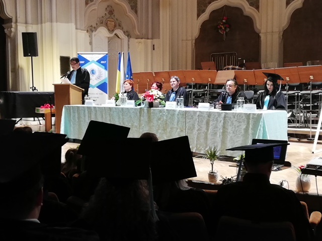Sub semnul Centenarului Marii Uniri de la 1 Decembrie 1918 și a împlinirii a 20 de ani de existență a Filialei GOLDIȘ Satu Mare, la Filarmonica de stat DINU LIPATTI a avut loc vineri, 18 mai, cursul festiv dedicat absolvenților Universității de Vest VASILE GOLDIȘ Arad – Filiala Satu Mare. Cursul festiv a fost dedicat absolvenților, care au urmat cursurile Facultății de Științe Economice, Informatică și Inginerie, cu specializările: Marketing, Contabilitate și Informatică de gestiune, precum și absolvenților Facultății de Științe Socio-Umane, Educație Fizică și Sport, cu specializările: Pedagogia Învățământului Primar și Preșcolar; Relații Internaționale și Studii Europene. La cursul festiv, alături de studenți, părinți, rudenii, prieteni și alți invitați, au participat cadre didactice ale Filialei GOLDIȘ Satu Mare: conf. univ. dr. VASILE LAZĂR – directorul Filialei GOLDIȘ Satu Mare, prof. univ. dr. CLAUDIU PORUMBĂCEAN, conf. univ. dr. OLIMPIA NEAGU, conf. univ. dr. MIRCEA TEODORU, lect. univ. dr. SIMONA MACARIE și absolventa BETTINA NAGY – reprezentanta studenților. După intonarea imnului Universității VASILE GOLDIȘ și a imnului studenților “Gaudeamus”, conf. univ. dr. Mircea Teodoru a adresat cuvinte de felicitare absolvenților și a menționat faptul că acest curs festiv se desfășoară în anul Centenarului Marii Uniri și a împlinirii a 20 de ani de existență a Filialei GOLDIȘ Satu Mare.