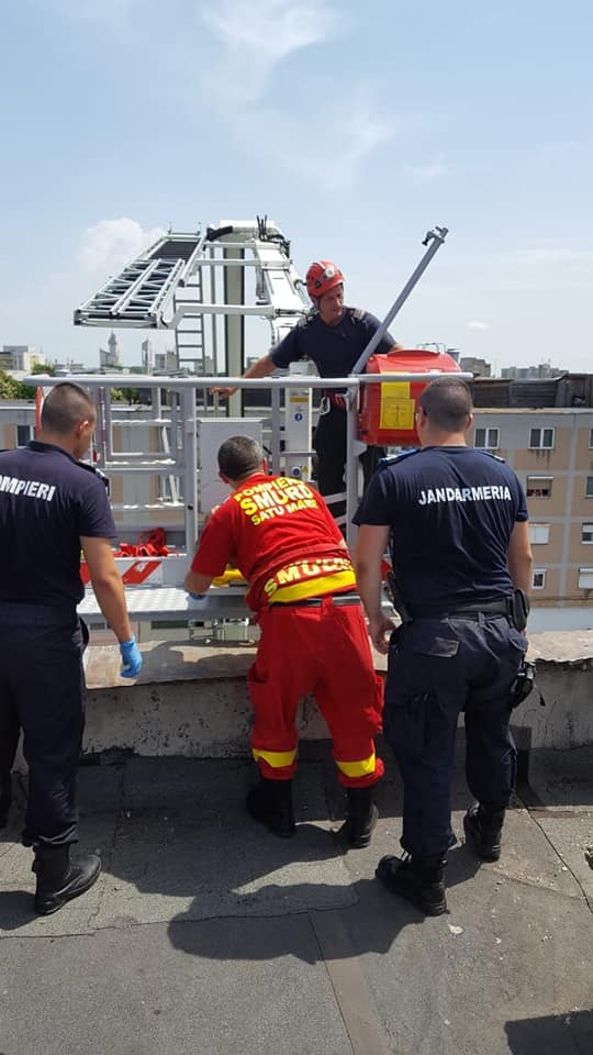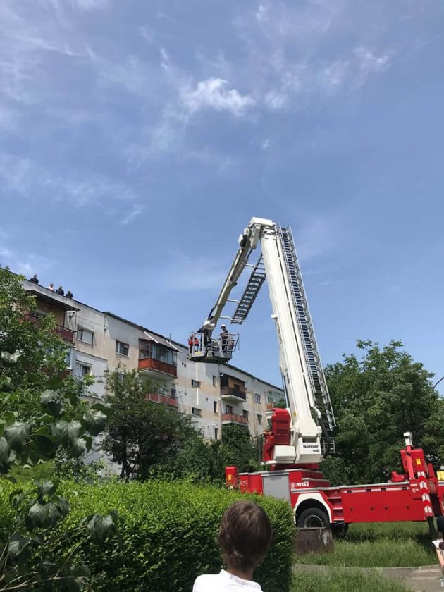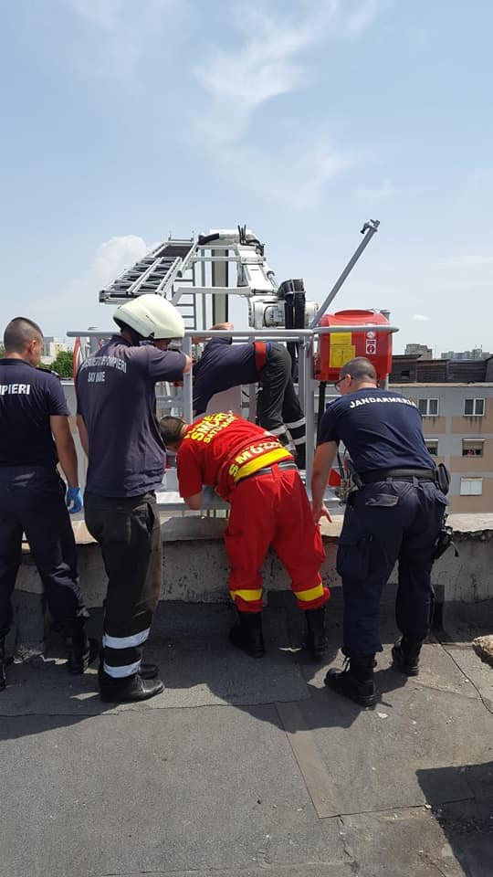 Jandarmii au urcat pe acoperișul blocului și au reușit imobilizarea persoanei, care se afla într-o stare mare de agitație. A fost nevoie și de prezența unui medic, care a sedat persoana, iar pompierii militari au intervenit cu ajutorul autospecialei de lucru la înălțime pentru preluarea si coborârea bărbatului.
