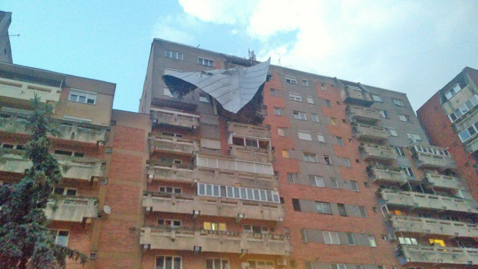 Acoperiș smuls de pe un bloc în Centrul Nou O situație de urgență, care ar fi putut avea urmări grave, s-a produs prin desprinderea unei bucăți de acoperiș (de aproximativ 130 metri pătrați), de pe un bloc de locuințe de 10 nivele, situat în Piața 25 Octombrie din municipiul Satu Mare. Din cauza vântului puternic, o parte din acoperișul imobilului a fost smuls rămânând suspendat de un cablu, la nivelul etajelor 8 – 10.