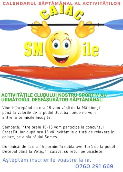 Sâmbătă între orele 10-13 clubul sportiv va participa la concursul Cross FIT, iar după ora 15.00 va urma o tură de relaxare în caiace, pe albia râului Someș.