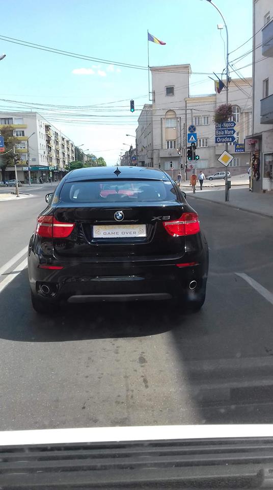 Este vorba despre un BMW X6 care în loc de plăcuțele de înmatriculare obișnuite cu cifre și litere, era trecut doar atât: GAME OVER. Și câteva floricele. Mașina a fost văzută în zona centrală a Sătmarului