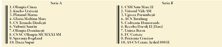Seria B e una a satelitilor. Recolta II Dorolt , CSM II Satu Mare si Cetate II Ardud sunt satelitii ce pot promova in esalonul superior doar daca echipa mare ajunge in Liga a 3-a!