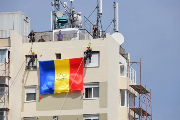 ⦁ Coborârea de la înălțime (de pe un bloc de 10 etaje) cu drapelul României;