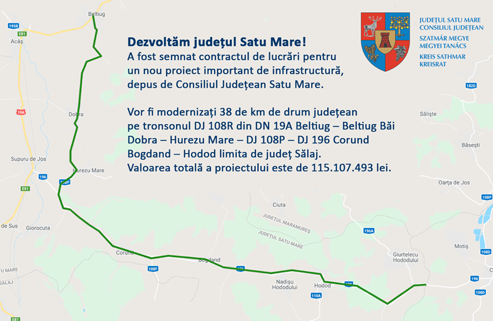 A fost semnat contractul de lucrări pentru un nou proiect important de infrastructură, depus de Consiliul Județean Satu Mare, și care a obținut finanțare din partea Uniunii Europene și a Guvernului României. Este vorba despre proiectul “Modernizarea drumurilor județene DJ 108R din DN 19A Beltiug – Beltiug Băi – Dobra – Hurezu Mare – DJ 108P – DJ 196 Corund – Bogdand – Hodod limita de județ Sălaj”, finanțat prin Programul Operațional Regional 2014-2020.