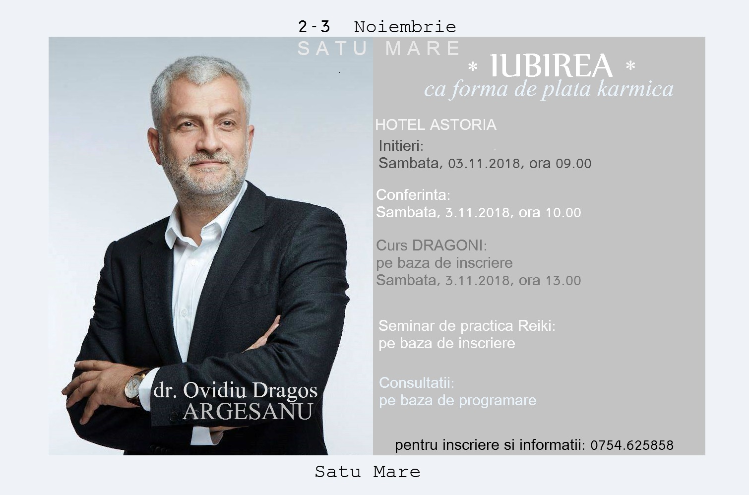 Prezent în Satu Mare la începutul lunii noiembrie doctorul Ovidiu Dragoș Argeșanu v-a susține o serie de consultații și o conferință cu tematica ”Iubirea - ca formă de plată karmică”.
