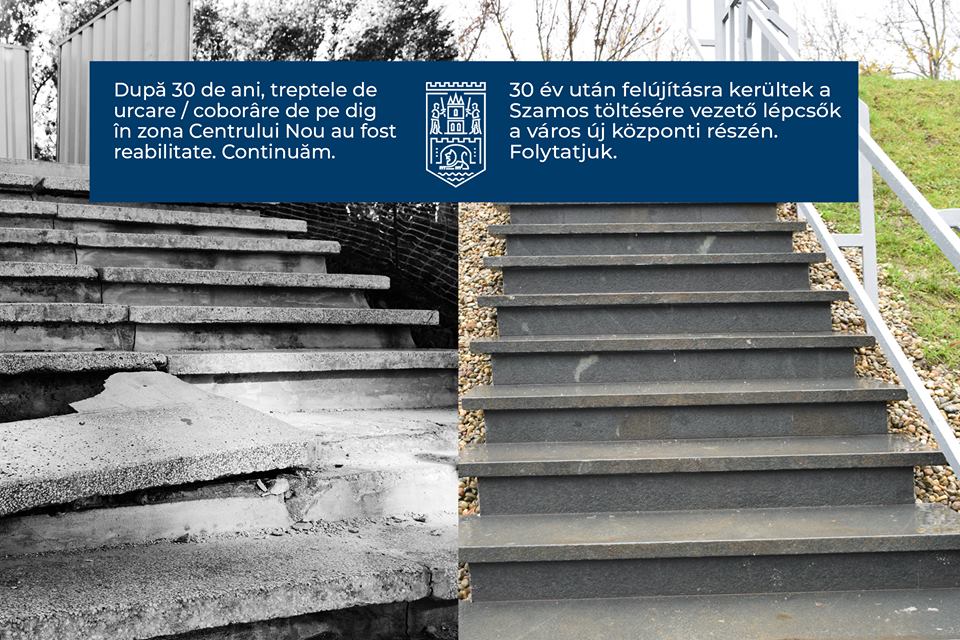 Au fost finalizate lucrările de refacere a treptelor de urcare/ coborâre de pe dig, în zona Centrului Nou al municipiului Satu Mare. Reabilitarea Centrului Nou este o prioritate pentru Primăria Municipiului Satu Mare / Szatmárnémeti și se va realiza printr-un proiect finanțat din fonduri europene.