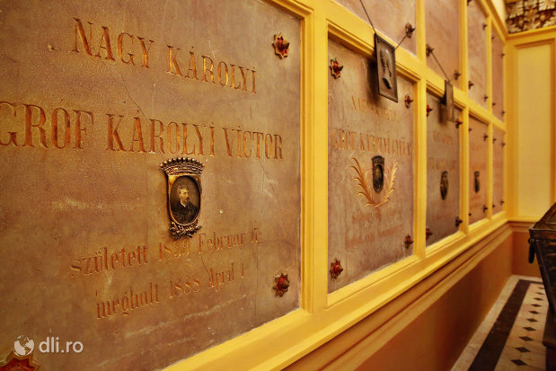 Cel mai vechi sicriu este al nobilei doamne Lapispataki Seghnyei Borbala, decedată în 1653, iar cel mai recent al grofului Karolyi Imre, decedat în 1943. Oriunde au murit în lume, reprezentanţii familiei Karolyi, care deţineau întinse suprafeţe de terenuri în zona Careiului, au fost aduşi şi înmormântaţi aici cu onoruri. Ca într-o poveste de iubire a vremii, după moarte, inimile soţiilor au fost îmbălsămate şi puse în urne de argint chiar peste sicriele a doi grofi şi se află şi azi în acelaşi loc.