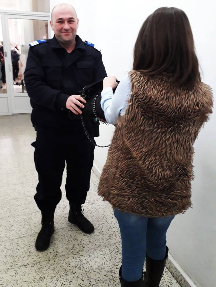 Şansa ei a fost vigilenţa colegului nostru – plt. maj. Chişiu Iuliu, care a scutit-o de o eventuală pagubă. La scurt timp după ce femeia a părăsit clădirea, subofiţerul de jandarmi a observat poşeta, a procedat la identificarea proprietarului şi a reuşit să o contacteze.