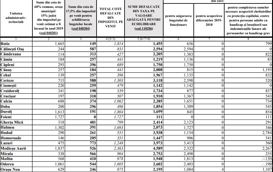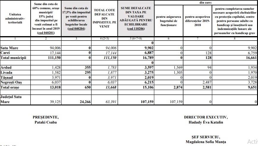 În vederea repartizării, sumele defalcate din taxa pe valoarea adăugată au fost comunicate instituției județene de Ministerul Finanțelor, Consiliul Județean Satu Mare având doar rol consultativ. Sumele aprobate astăzi de aleșii județeni se repartizează bugetelor locale ale comunelor, oraşelor, municipiilor şi judeţului, în completarea veniturilor proprii, proporţional cu necesarul stabilit pe total judeţ, pentru asigurarea unui buget de funcţionare pentru anul 2019.