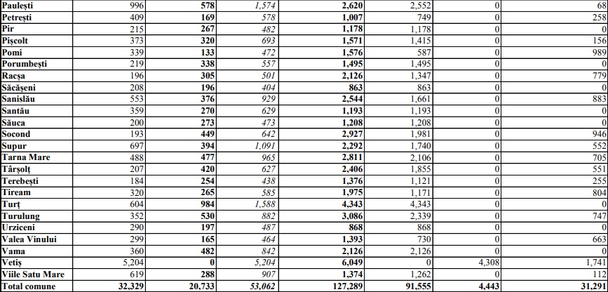 În continuarea prezentăm tabelul cu sumele repratizate fiecărei primării din județul Satu Mare cu specificația că fiecare sumă din acest tabel este calculată în mii lei.
