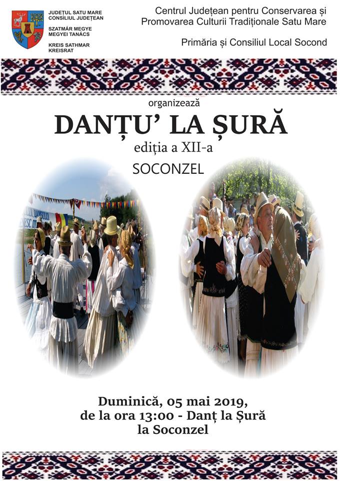 Centrul Judeţean pentru Conservarea şi Promovarea Culturii Tradiţionale Satu Mare cu sprijinul Consiliului Județean Satu Mare și în parteneriat cu Primăria și Consiliul Local Socond, organizează duminică 5 mai, de la ora 13:00, în Soconzel, cea de-a XII-a ediție a festivalului folcloric „Danțu’ la șură”.