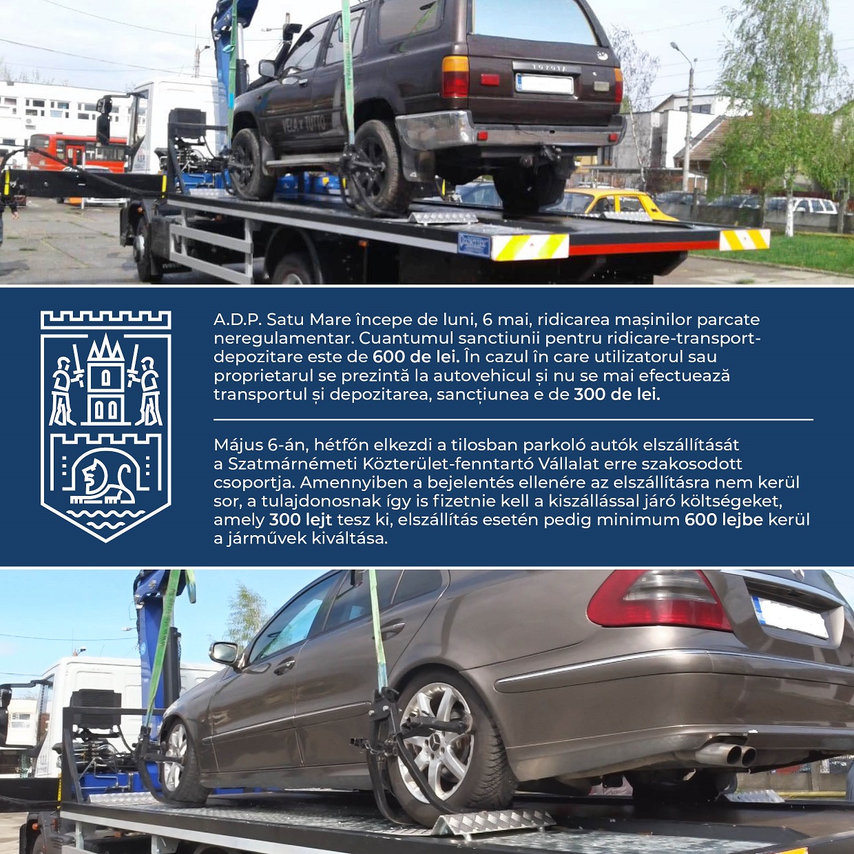 A.D.P. Satu Mare începe de luni, 6 mai, ridicarea mașinilor parcate neregulamentar. Cuantumul sanctiunii pentru ridicare-transport-depozitare este de 550 de lei. În cazul în care utilizatorul sau proprietarul se prezintă la autovehicul și nu se mai efectuează transportul și depozitarea, sancțiunea e de 300 de lei.
