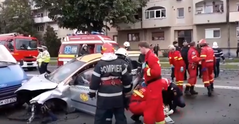 Impactul a fost iminent. În urma impactului, mașina de taxi a ricoșat într-o autilitară, iar mașina Audi a trecut peste trotuar și s-a oprit într-un bloc. Doar norocul a făcut ca în acel moment pe trotuar să nu se afle nimeni.