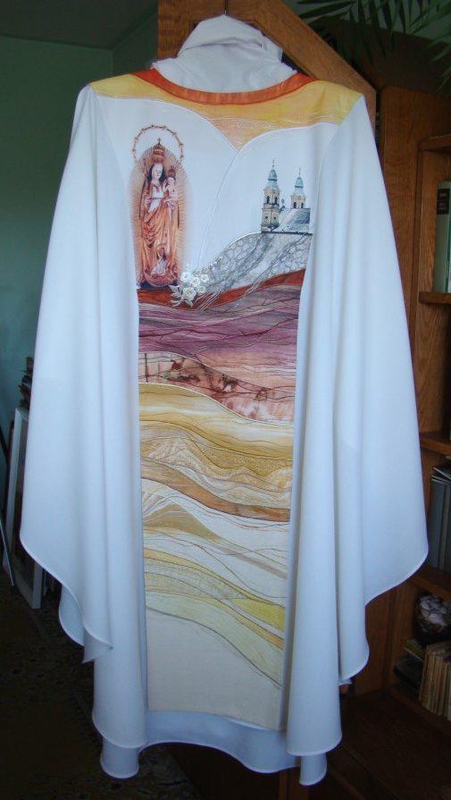 Veșmântul pe care Papa Francisc l –a purtat sâmbătă conține mai multe simboluri, pe partea din spate a veșmântului aflându-se logoul vizitei Papei în România. Simbolurile și decorațiunile de pe veșmântul Papei au fost realizate manual de către artista, care a combinat mătase cu fir auriu și cu țesături colorate.