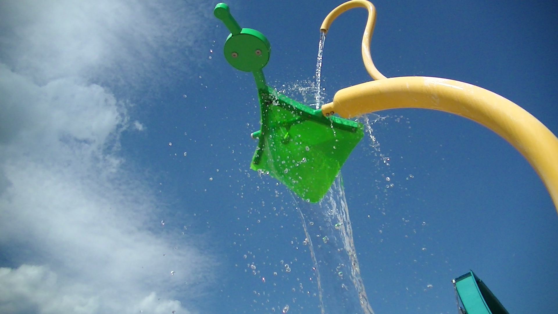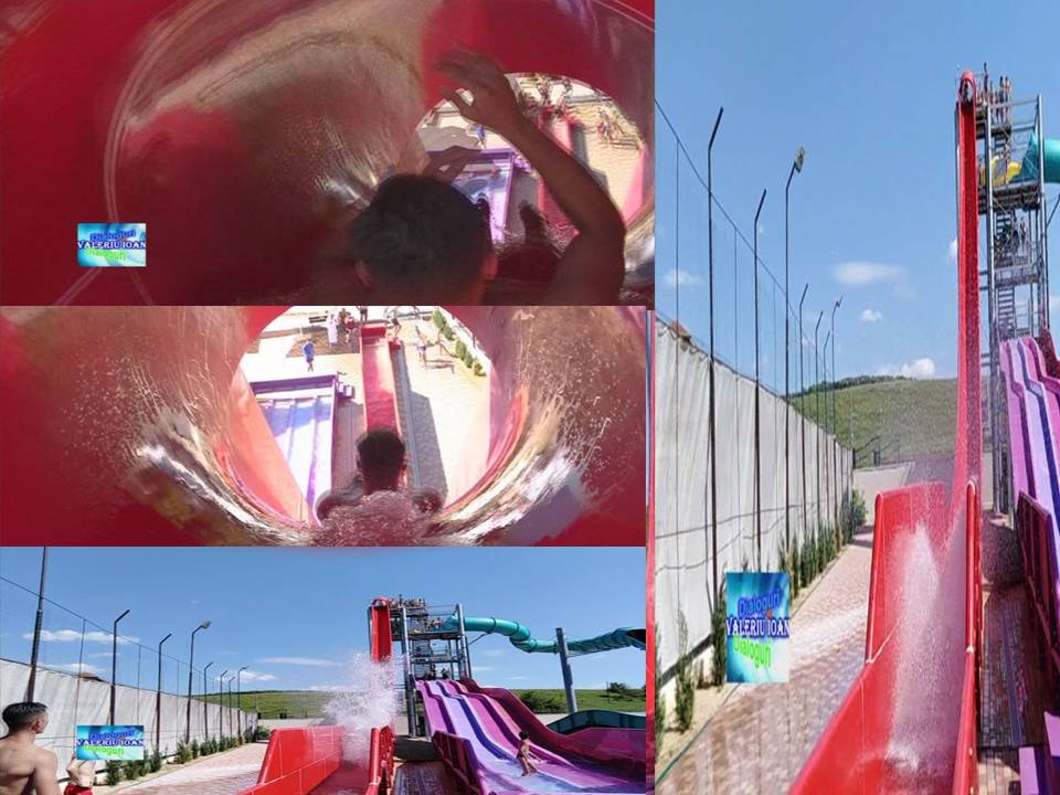 Ne aflãm în zona nouã de extindere a Aqua Park – ului … în spatele meu se vãd toboganele pe care le-am deschis anul trecut, undeva la jumãtatea sezonului și care au avut un succes extraordinar, e o zonã de atracție pentru clienți, pentru cã oferã multã distracție, amuzament, produce adrenalinã … iar în plan apropiat avem un splash pentru copii, care-i ajutã foarte mult pe pãrinți; în momentul în care ajung în aceastã zonã, practic nu mai trebuie sã poarte grija copiilor. Au un loc plãcut pentru ei, cu activitãți de tot felul, iar pe perioada sezonului, aceste facilitãți sunt completate și de animatorii pe care-i avem pe tot parcursul acestui sezon, care vor organiza diverse concursuri, activitãți pentru copii … tot felul de activitãți pe care sã-i ținã ocupați și care sã le aducã mulțumire, pentru cã se simt bine, cât și pãrinților pentru cã o orã … douã scapã de grija copiilor și … toatã lumea-i mulțumitã”.