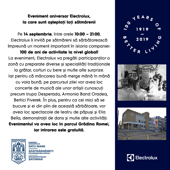Pe 14 septembrie, cu ocazia aniversării a 100 de ani de activitate la nivel global, Electrolux face un cadou sătmărenilor și angajaților săi și îi așteaptă pe toți la un eveniment special, cu multe surprize. Evenimentul va avea loc în Grădina Romei, între orele 10:00 – 21:00, iar accesul este gratuit.