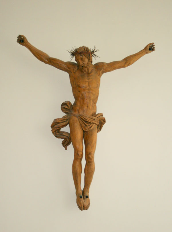 Monumentala casă a scărilor este decorată din 2006 cu un imens Cristos răstignit sculptat în lemn, realizat în anul 1777. Corpusul ar fi ajuns prin intermediul conţilor Károlyi în capela cetăţii din Ardud. După aceea a stat un timp în biserica din Şandra, apoi a fost dusă la Căpleni, iar de aici a ajuns la palatul episcopal. Dincolo de valoarea artistică, este şi aceasta o relicvă ce aminteşte de poetul Petőfi.