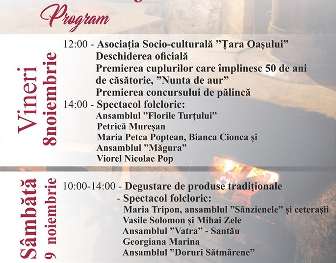 Pălincă naturală, produse alimentare tradiționale și produse de artizanat vor putea fi degustate, admirate și achiziționate timp de 2 zile în atmosfera deosebită creată de un spectacol folcloric în care vor fi promovate tradițiile românești, portul, dansul și cântecul tradițional.
