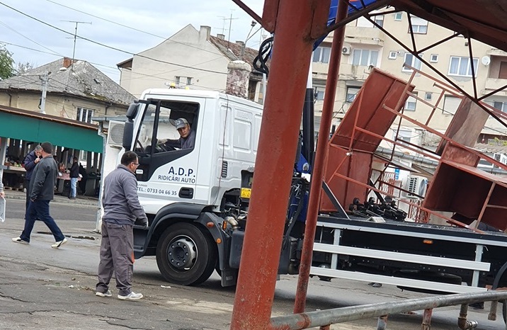 Se pare că angajaţii ADP care ridică maşini au trecut la nivelul următor. Nu ridică doar maşini arcate aiurea ci şi... tarabe plasate aiurea în piaţă.