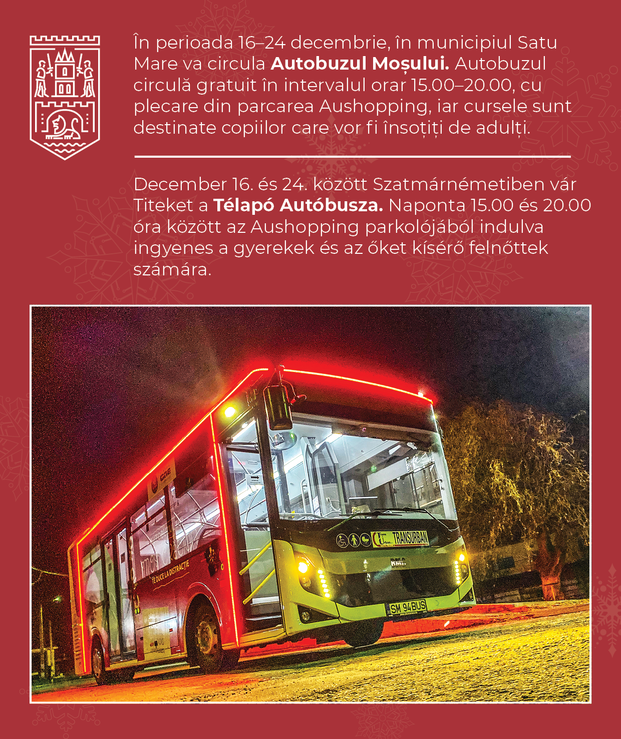Autobuzul Moșului este oferit gratuit de Transurban Satu Mare cu sprijinul Aushopping Satu Mare și Primăria Municipiului Satu Mare.