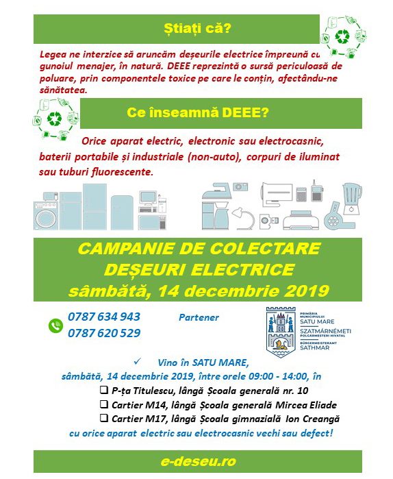 Primăria Municipiului Satu Mare și Serviciul Local de Colectare Satu Mare din cadrul Asociației Române pentru Reciclare – RoRec, împreună cu partenerii locali, încurajează cetățenii să colecteze și să recicleze aparatele electrice vechi sau uzate în cadrul unei noi campanii de colectare a deșeurilor electrice și electronice.