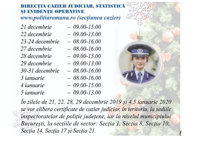 Venind în sprijinul cetățenilor, pentru reducerea timpului de așteptare la ghișee în perioada sărbătorilor de iarnă și pentru a răspunde cât mai operativ și eficient solicitărilor, în perioada 21.12.2019-05.01.2020 la nivel național a fost stabilit un program de lucru unitar la nivelul ghișeelor de eliberare a certificatelor de cazier judiciar.