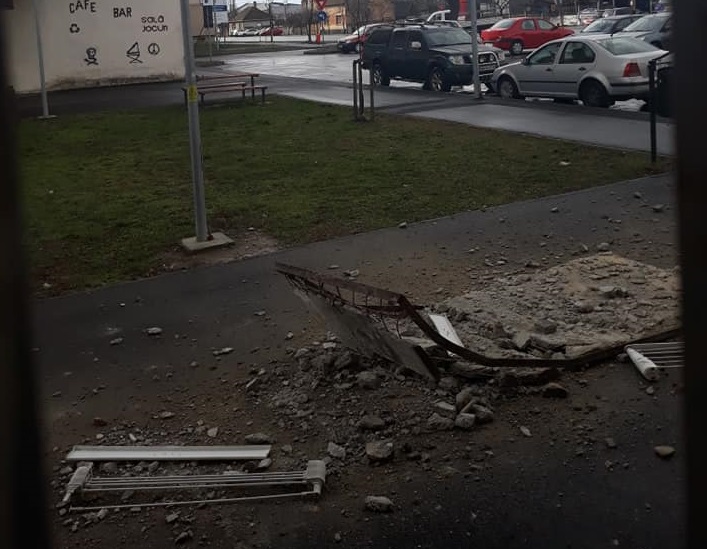 Bucățile de metal și tencuială au căzut de la etajul cinci al unui bloc la parterul căruia se află mai multe magazine, cu trafic pietonal intens.