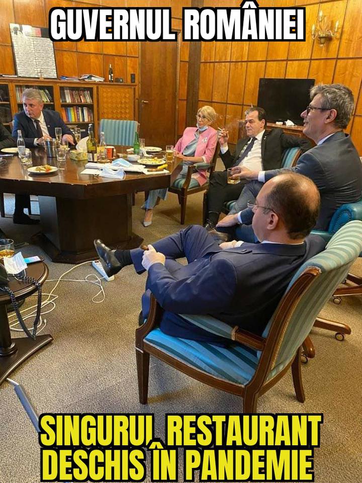 ”Din categoria învăţămintele premierului Orban către popor, azi lecţia Reguli de igienă: se fumează şi în sala de şedinţe de Guvern!”, a scris pe Facebook Cristian Vasilcoiu, cel care a publicat fotografia.O fotografie în care apare premierul Ludvic Orban cu ţigara aprinsă în mână şi mai mulţi miniştri care au în mână pahare sau ţigări a fost publicată, vineri, pe Facebook.