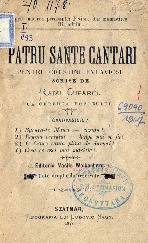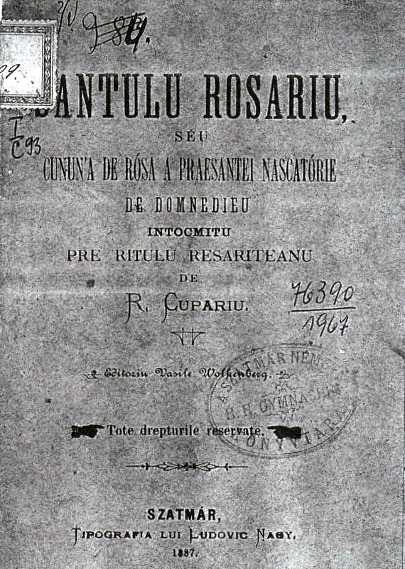 Ambele lucrări au apărut în anul 1887, la Satu Mare, în tipografia lui Ludovic Nagy, editor fiind Vasile Wolkenberg: Patru Sfinte cântări pentru creştini evlavioşi scrise de Radu Cupariu la cererea poporului şi Sfântul Rosariu sau cununa de roză a Preasfintei Născătoare de Dumnezeu întocmit pre ritul răsăritean de R. Cupariu. Ambele lucrări există în fondul Bibliotecii Judeţene Satu Mare.