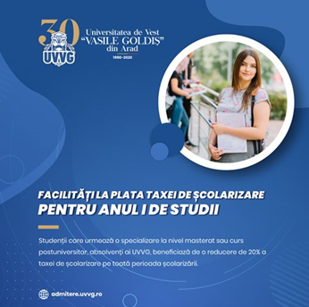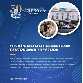 Mai multe detalii despre facilitățile și bursele Universității de Vest „Vasile Goldiș” din Arad oferite candidaților pentru Admitere se găsesc pe site-ul www.uvvg.ro.