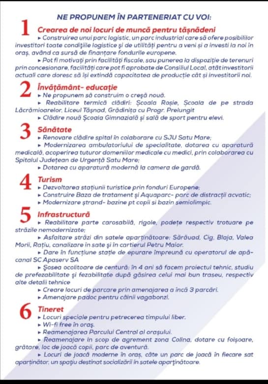 Dragi tășnădeni, Programul nostru electoral pentru mandatul 2020- 2024 este unul pornit de la cele mai mari nevoi, cele mai mari necesități ale orașului, un program construit împreună cu tășnădenii, ținând cont de ceea ce își doresc ei dar și de posibilitățile concrete de realizare. Crearea de locuri de muncă, îmbunătățirea condițiilor de studiu în învățământ, anveloparea blocurilor de locuințe dar și dezvoltarea infrastructurii, inclusiv a celei din sistemul de sănătate, amenajarea unei zone de agrement pentru tășnădeni, parcuri de joacă pentru copii dar și o piață agro- alimentară nouă, precum și multe alte proiecte ni le propunem pentru Tășnad, ele trebuie realizate în cel mai scurt timp. Am făcut cunoscut acest program în ultima săptămână în întâlnirile cu dvs. de pe teren. #ÎmpreunăschimbămTasnadul#
