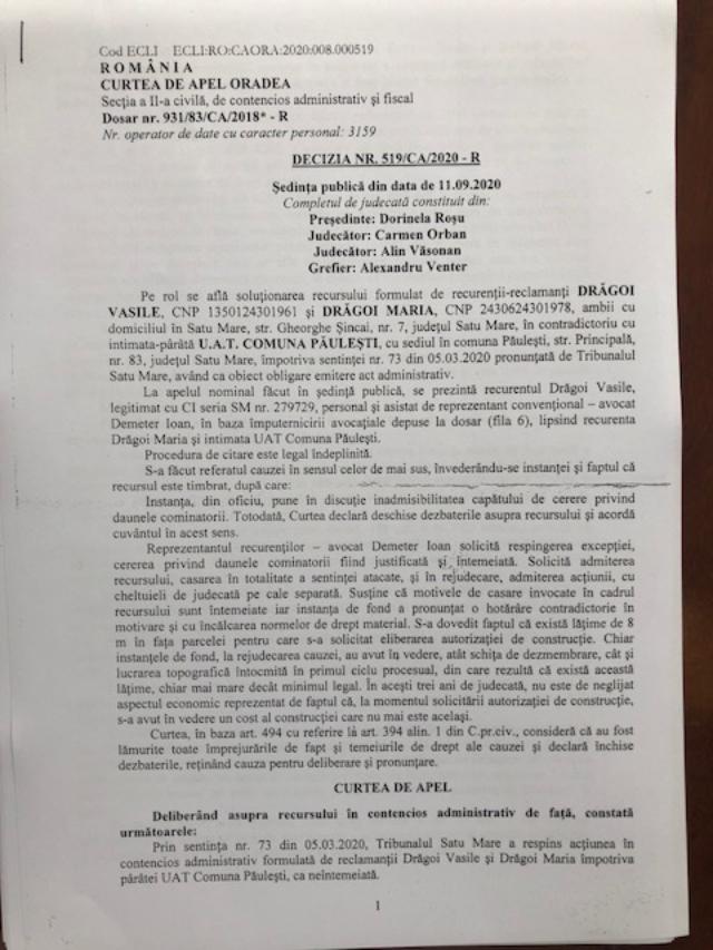 Acțiune în instanță În această situație, Vasile Drăgoi a acționat în instanță Primăria Păulești, proces câștigat de Drăgoi, potrivit Decizia Curții de Apel Oradea nr. 519/CA/2020-R din data de 11.09.2020. Cu toate acestea, deși există sentință definitivă și irevocabilă prin care s-a câștigat în instanță dreptul de a construi, ceea ce le-a fost respins proprietarilor de către actuala conducere a Primăriei Păulști, primarul Zenoviu Bontea refuză, pe mai departe, să pună în aplicare decizia magistraților.
