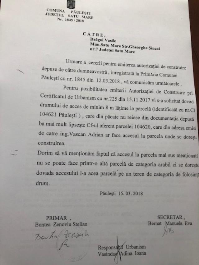 Numai că, trei zile mai târziu, în data de 15.03.2018, solicitantul Vasile Drăgoi primește răspuns din partea Primăriei Păulești potrivit căreia î se refuză eliberarea autorizației de construcție pe motiv că nu s-a fpcut dovada existenței unui drum de acces de cel puțin opt metri lățime.
